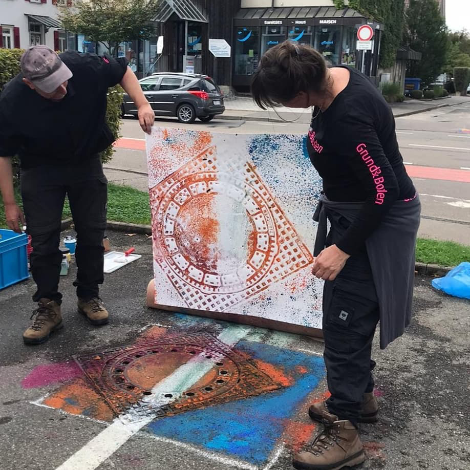 Grund und Boden erstellt mittels Planierwalzen, Pigmenten und Straßenstaub nach den örtlichen BODENRICHTWERTEN Bodenprofile auf Büttenpapier.