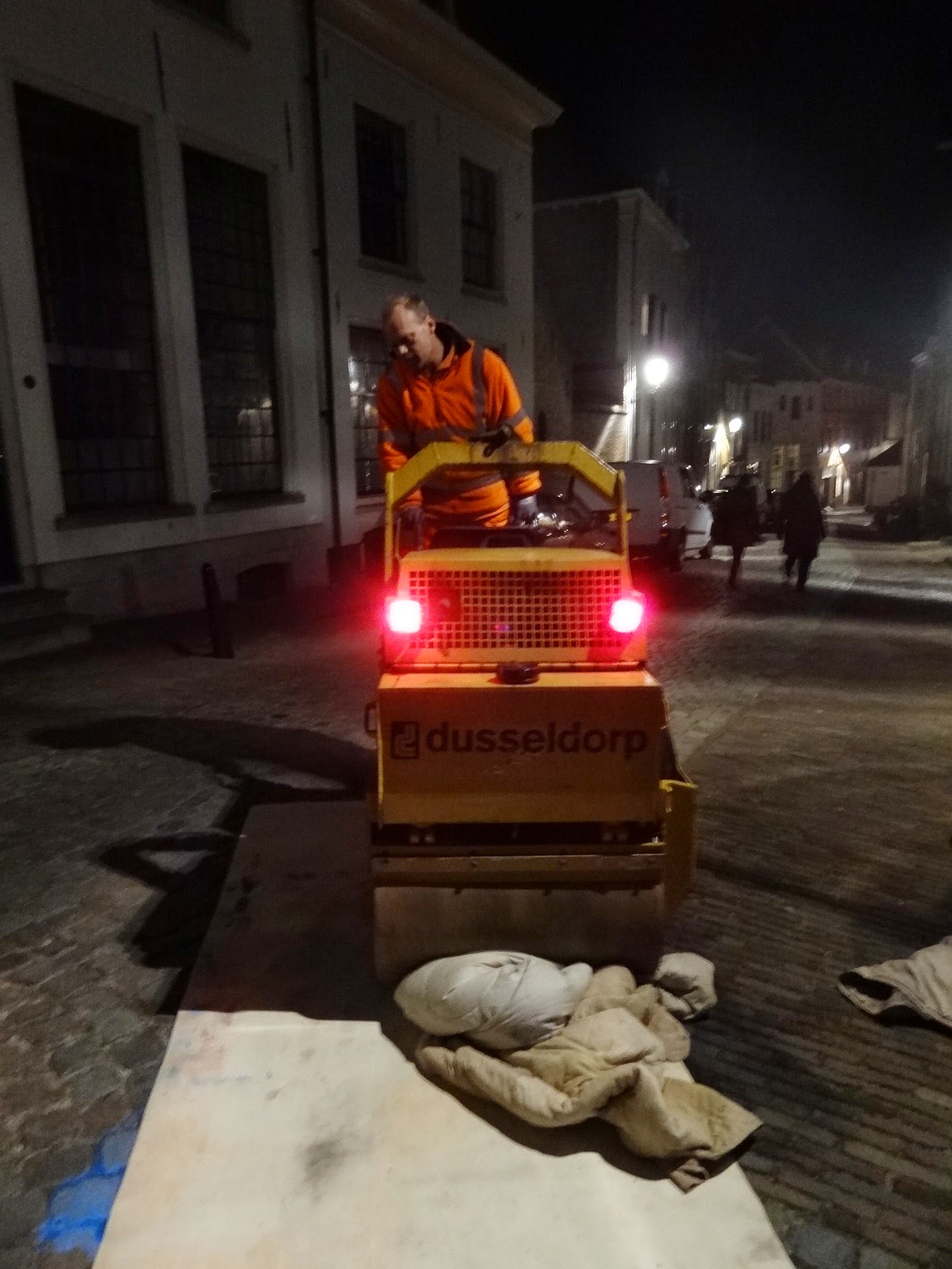 Die Firma DUSSELDORP stellte uns die Maschine und unser Drucker Erik walzte ab 19:45 Uhr drei kopfsteinige Prägedrucke, die wir im Laternenlicht der Dunkelheit in Overijssel erstellten. Traditionell erhält der Drucker ein Stück vom Druckwerk –
