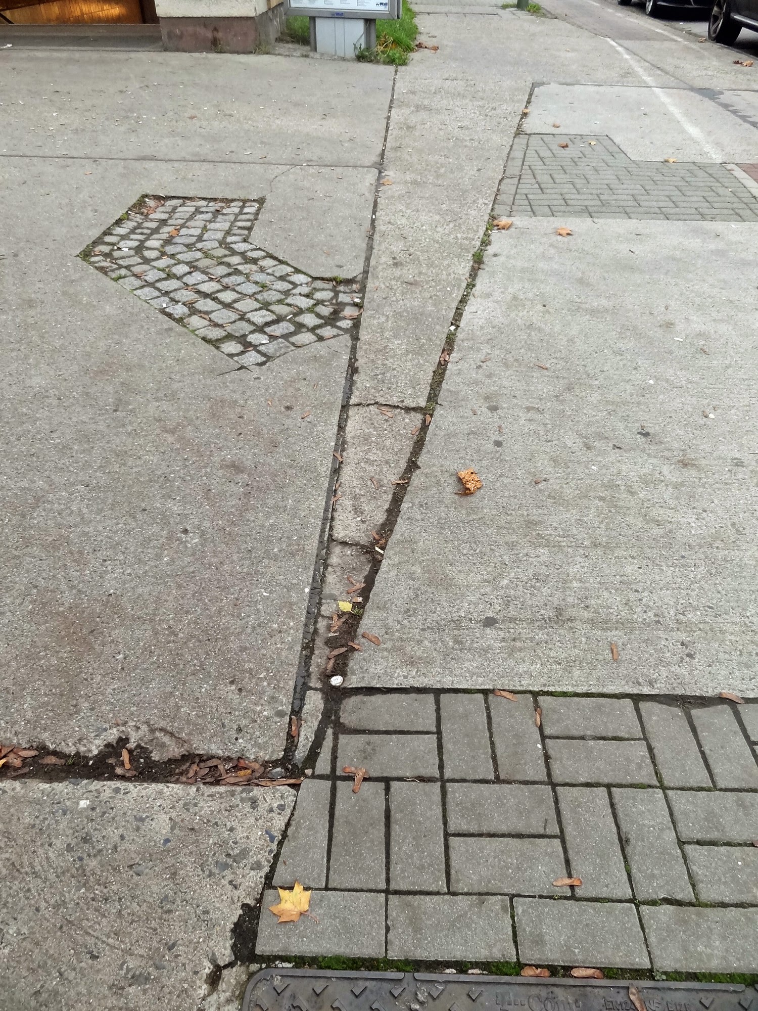 Von der alten DDR Fußwegplatte über partiell darunter und daneben liegendem Kopfgestein sowie weiteren hier nicht weiter spezifizierten Gesteins- und Plattenlegungen reicht das Spektrum der versiegelten Oberfläche.