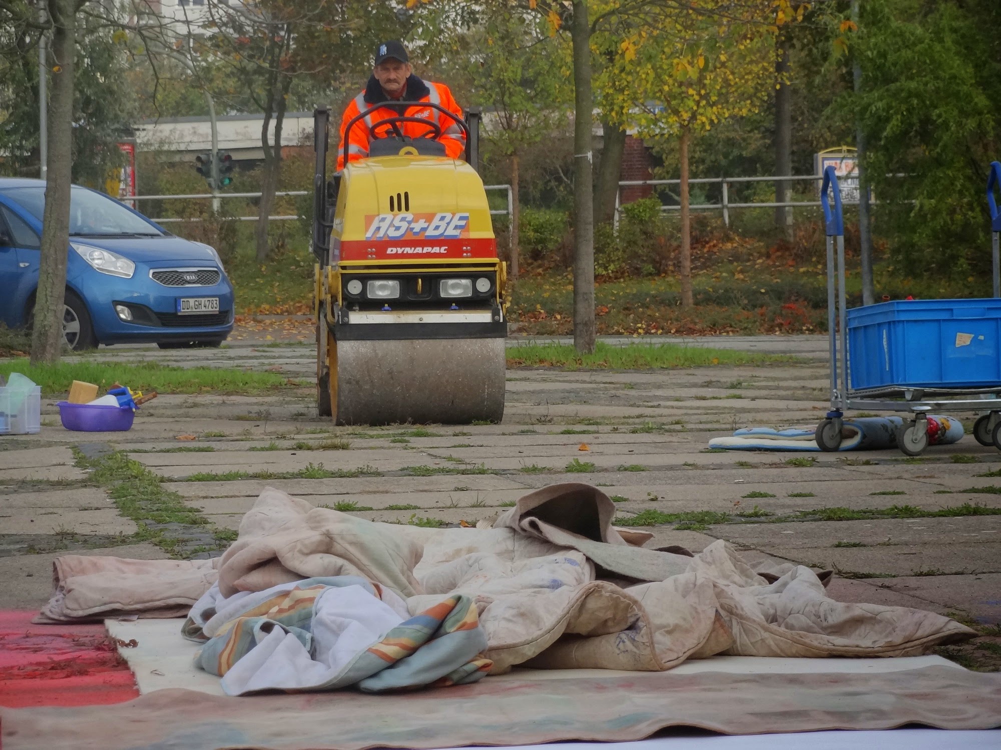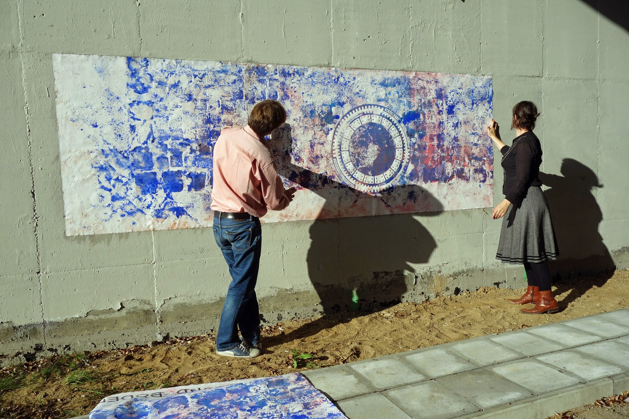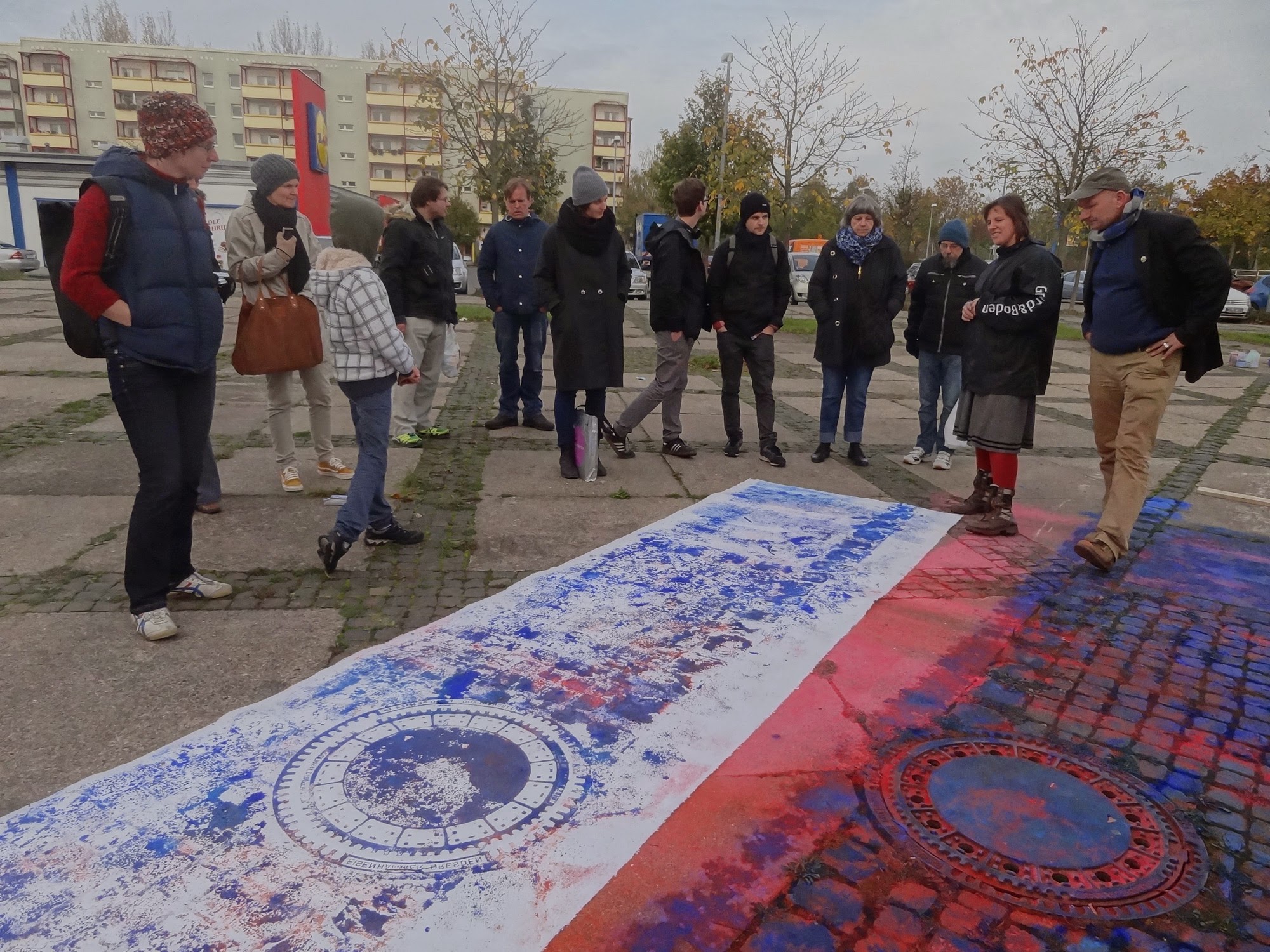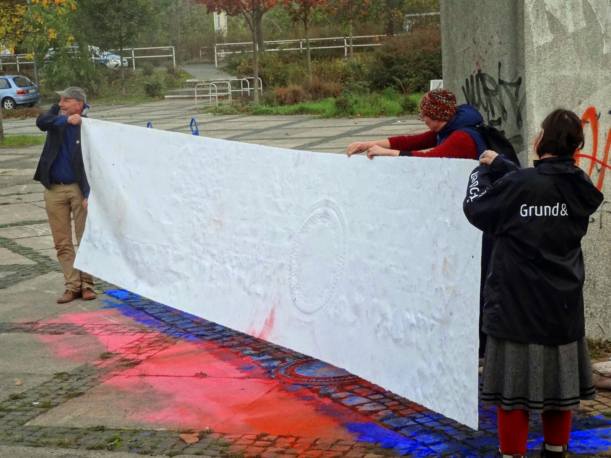 Am 25. Oktober 2014 sind wir von 11 bis 18 Uhr mit einer Planierwalze, Pigmenten, Filzen und schweren Büttenpapieren unterwegs in Berlin Hellersdorf entlang der U-Bahn Linie 5 vom Alice Salomon Platz bis zur Station Kaulsdorf Nord. Dort hängt unter der Brücke bis auf weiteres ein 6,15 x 1,25 m großer GRUND UND BODEN Druck, den zu besuchen wir Sie sehr herzlich einladen.