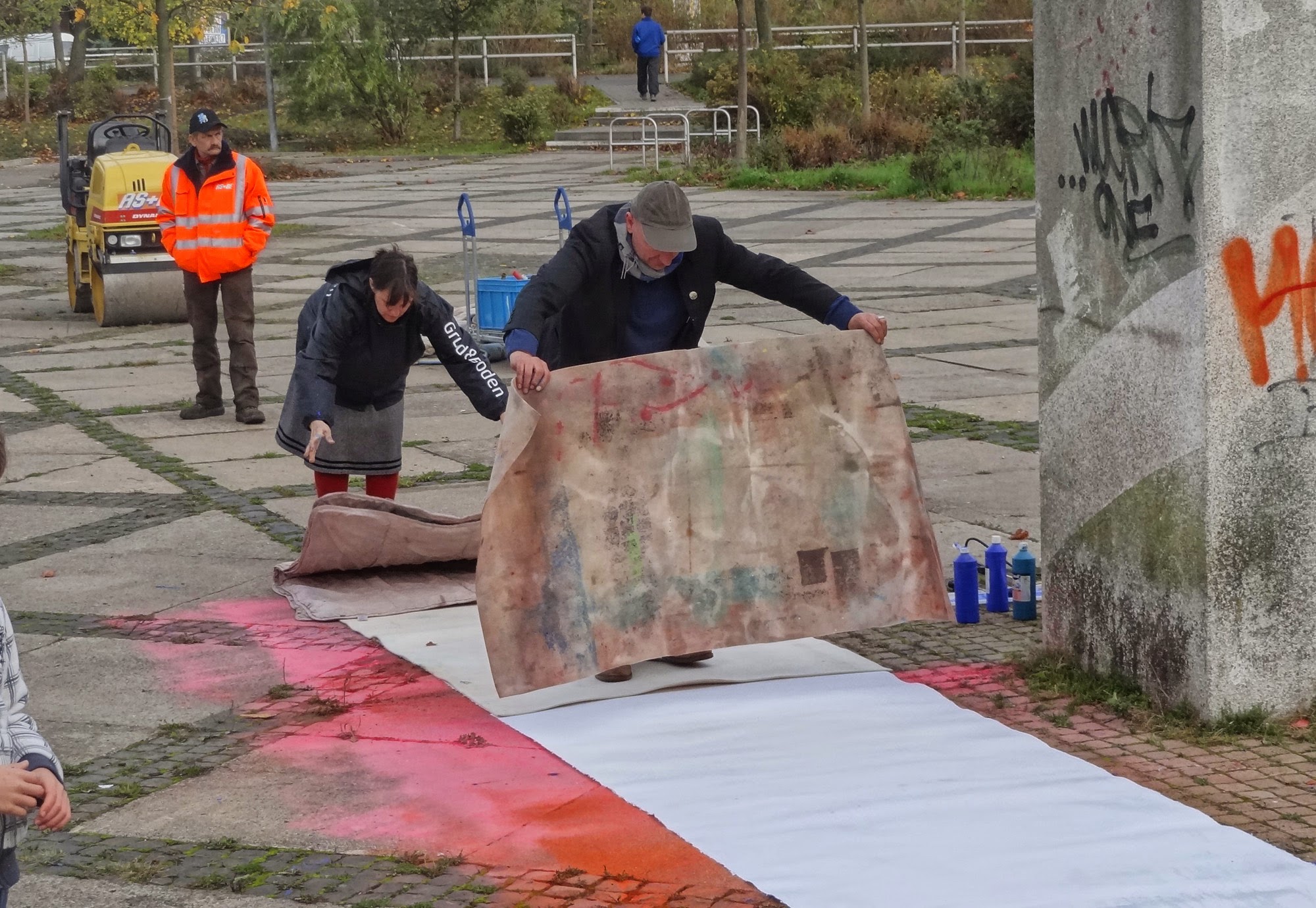 Am 25. Oktober 2014 sind wir von 11 bis 18 Uhr mit einer Planierwalze, Pigmenten, Filzen und schweren Büttenpapieren unterwegs in Berlin Hellersdorf entlang der U-Bahn Linie 5 vom Alice Salomon Platz bis zur Station Kaulsdorf Nord. Dort hängt unter der Brücke bis auf weiteres ein 6,15 x 1,25 m großer GRUND UND BODEN Druck, den zu besuchen wir Sie sehr herzlich einladen.