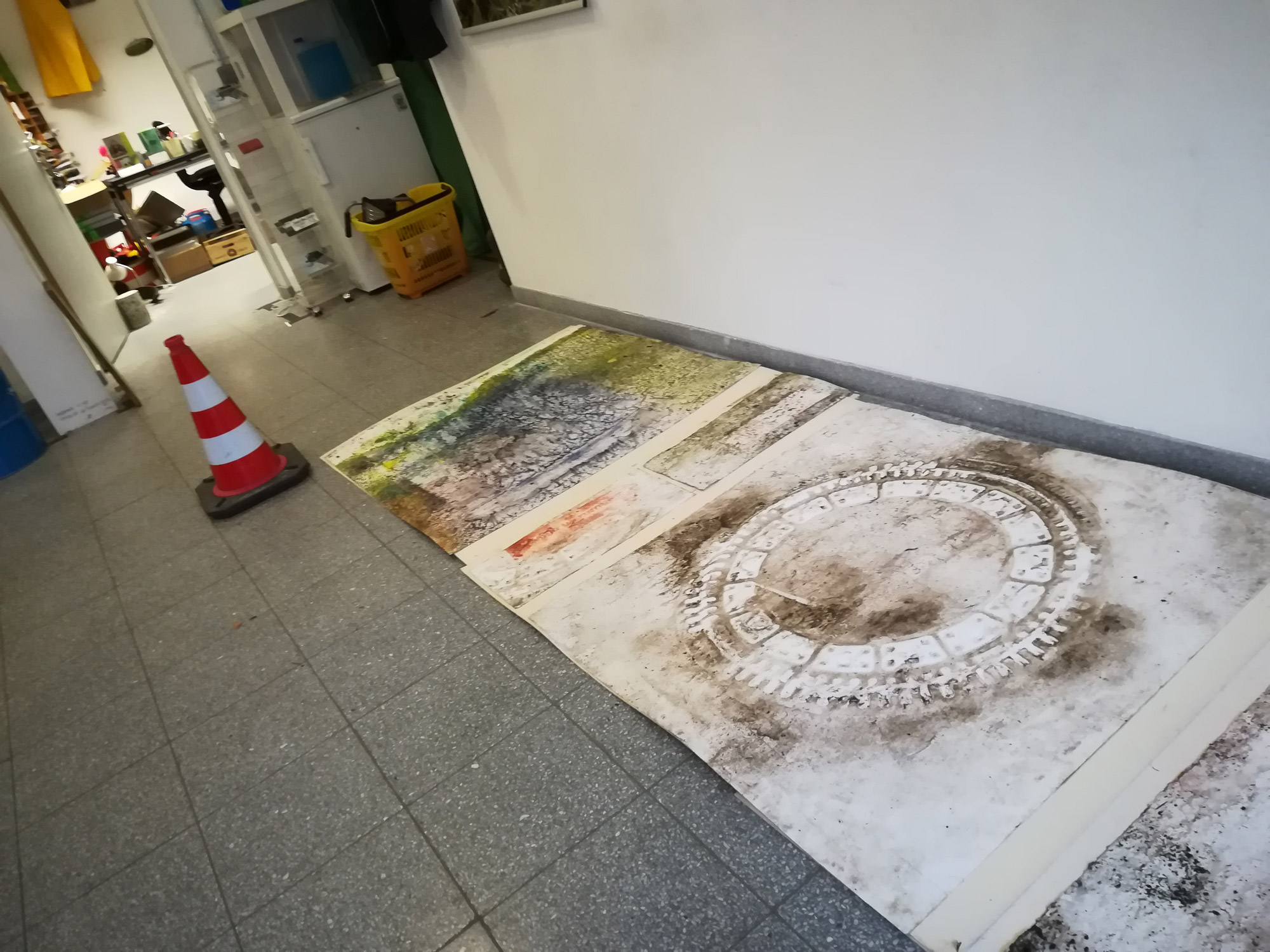 heute, am 31. Januar 2018, druckten wir in unserem Kiez in der Gutenbergstraße in Münster und wie immer arbeiteten wir mit dem Staub und Straßendreck, Pigmenten, Filzen, Kissen und prägten mittels einer tonnenschweren Planierwalze ein Bodenprofil in schweres Büttenpapier ein.