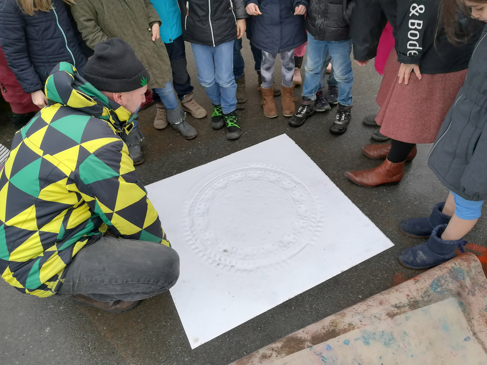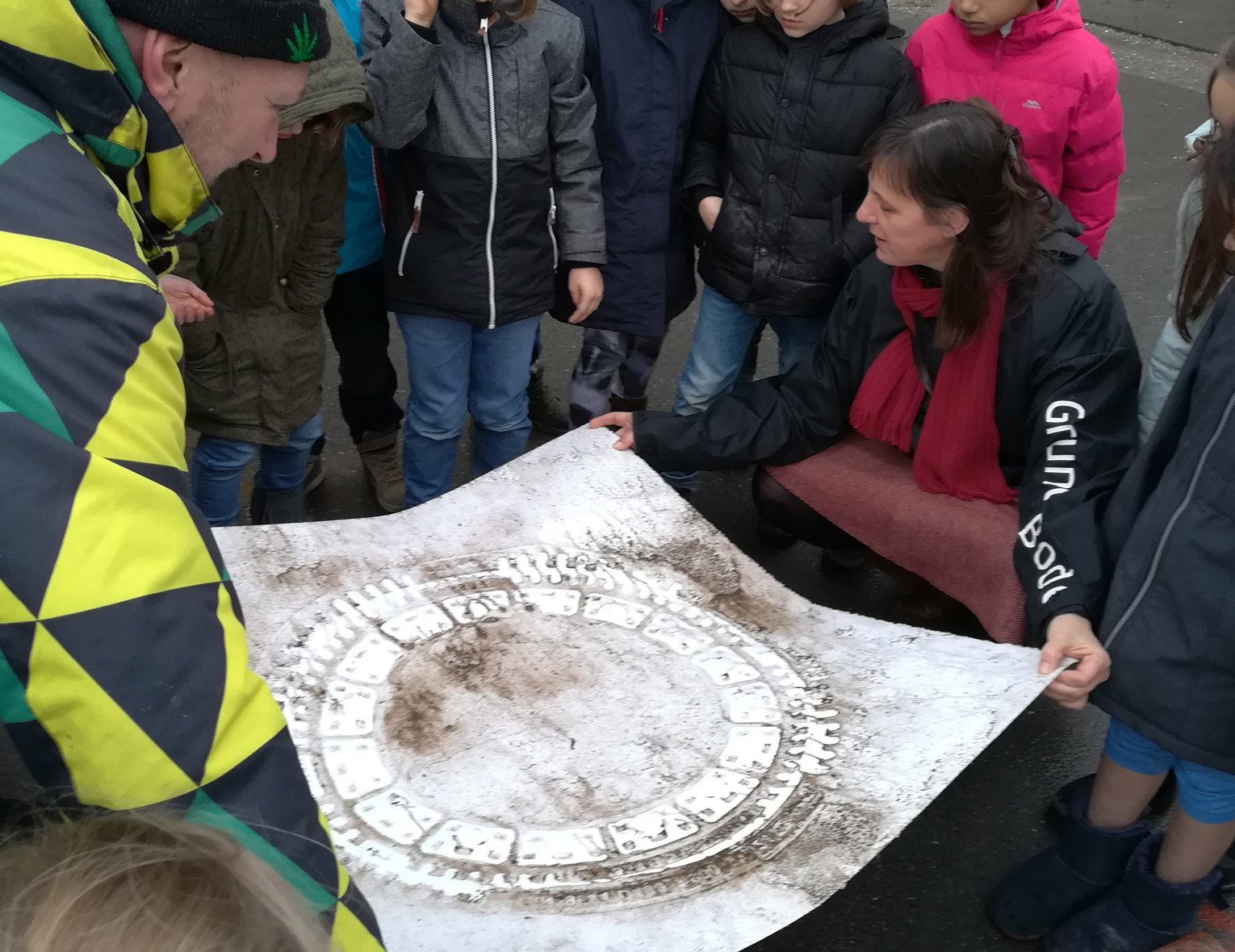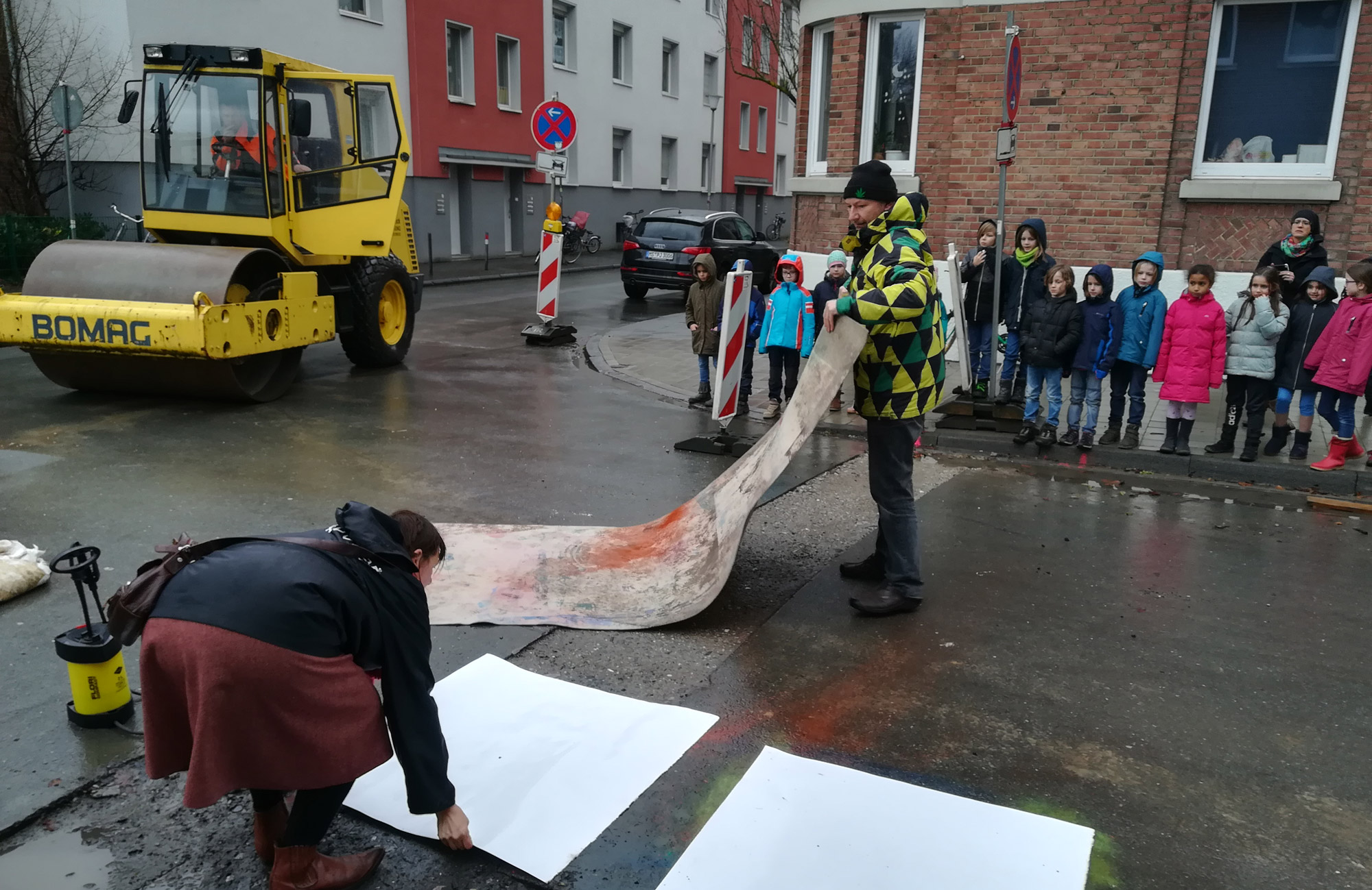 heute, am 31. Januar 2018, druckten wir in unserem Kiez in der Gutenbergstraße in Münster und wie immer arbeiteten wir mit dem Staub und Straßendreck, Pigmenten, Filzen, Kissen und prägten mittels einer tonnenschweren Planierwalze ein Bodenprofil in schweres Büttenpapier ein.